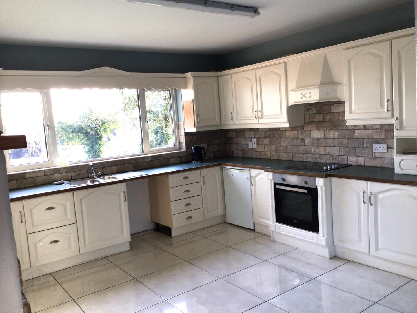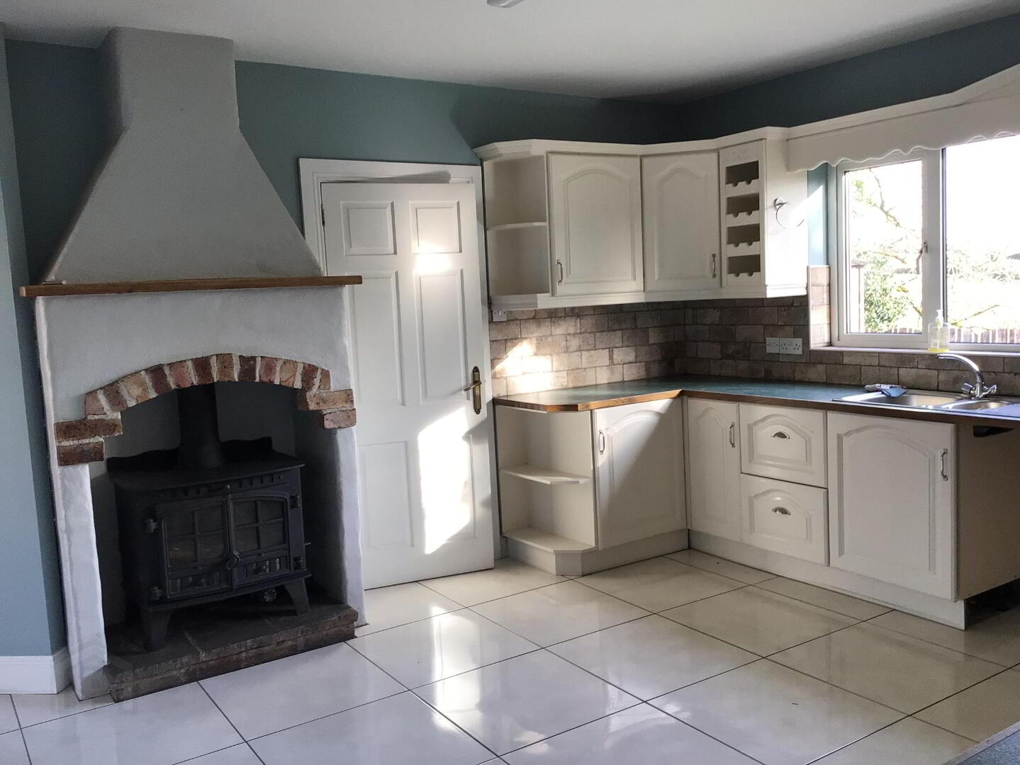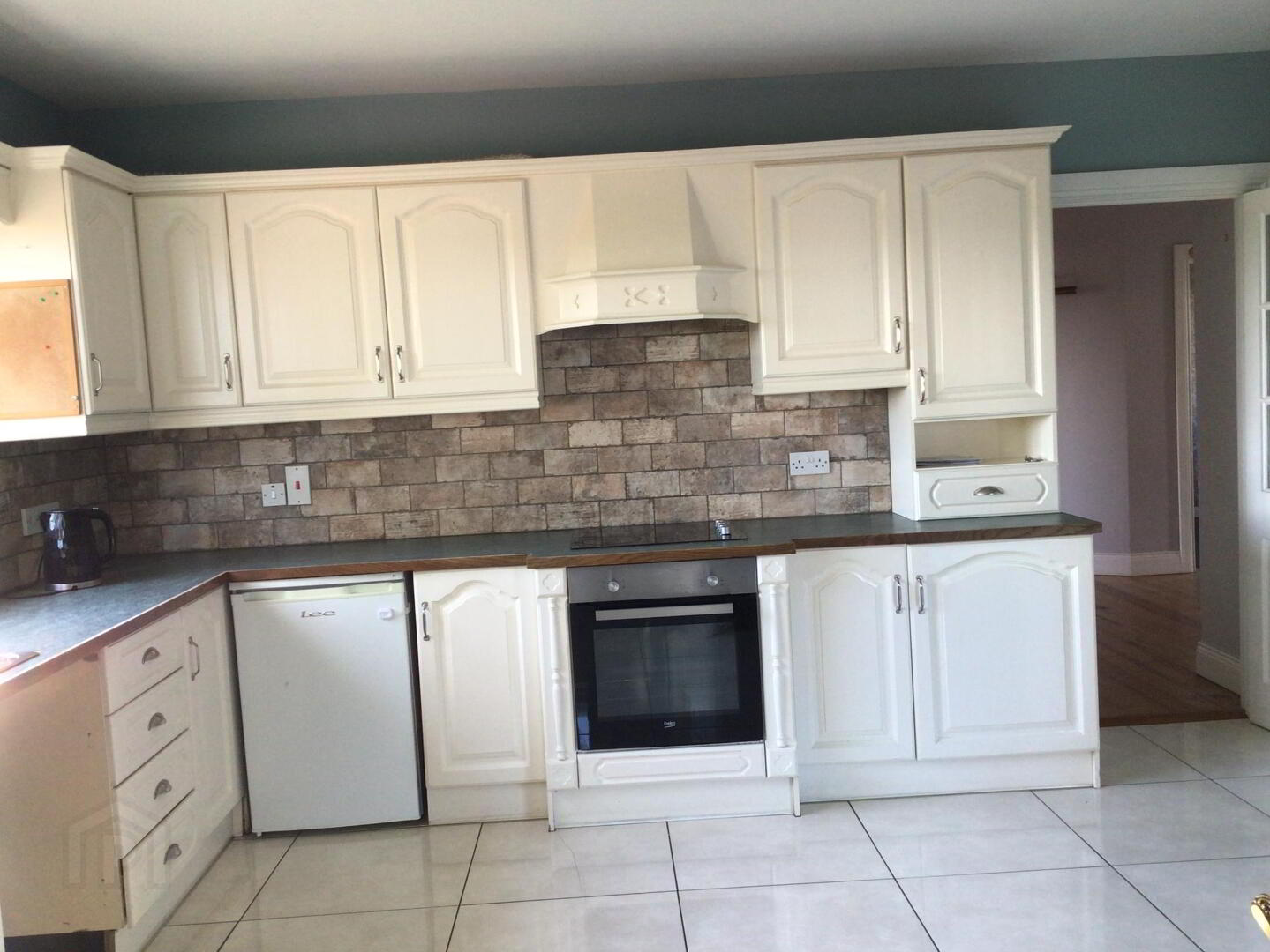 Extensive range of modern high & low level units. Beko built in 4 Plate Infa Red hobb, Built in Beko Single Oven. Single Drainer Sink Unit with Salad Bowl & Mixer Taps. Large Solid Fuel Stove. Fully Tiled Floor.