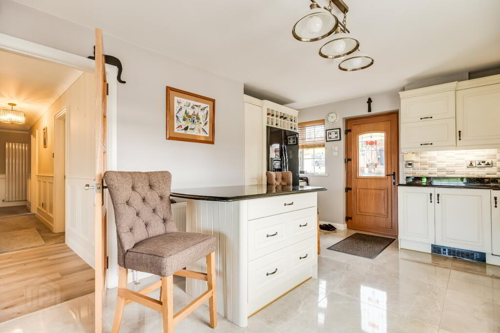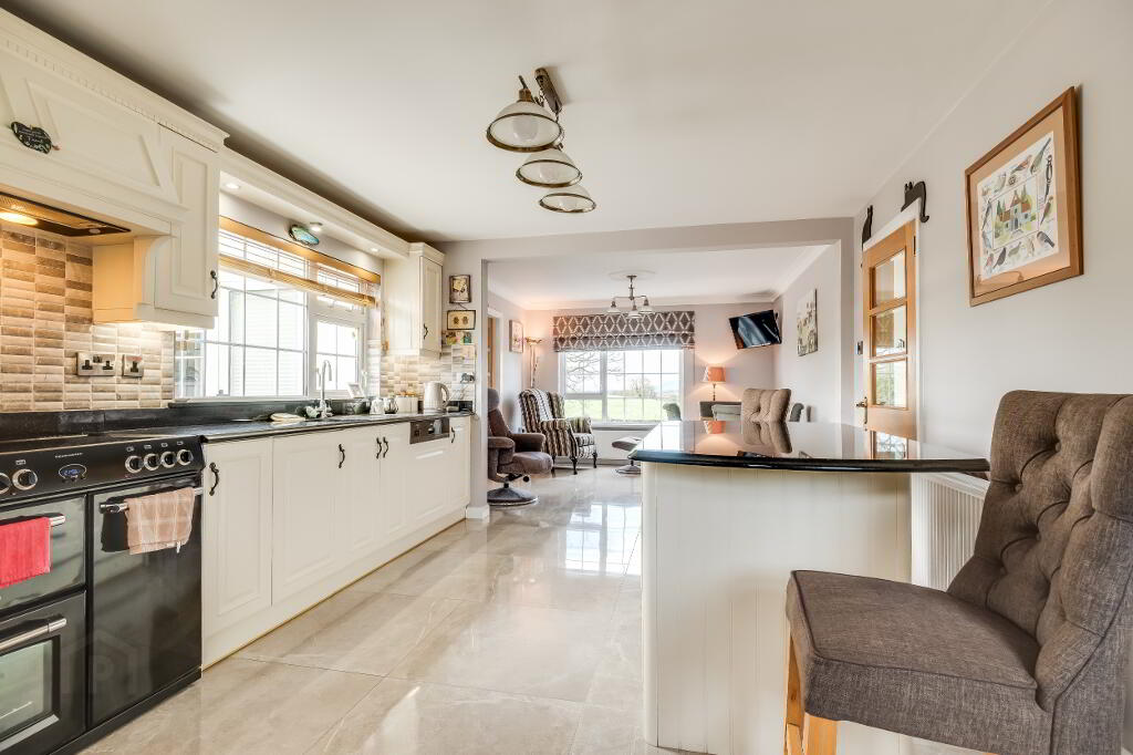 Modern fitted kitchen with a range of high & low level units, integrated dishwasher, Kensington Range cooker, extractor fan hood, granite work top & drainer board, stainless steel sink, island unit with breakfast bar lip, plumbed for American fridge freezer, wine rack, tiled floor & splash back, under unit lighting, Oak PVC exterior door with glazed inset, glazed door to hallway, views towards Enniskillen & Belmore mountain, ceiling cornice & moulded centrepiece.