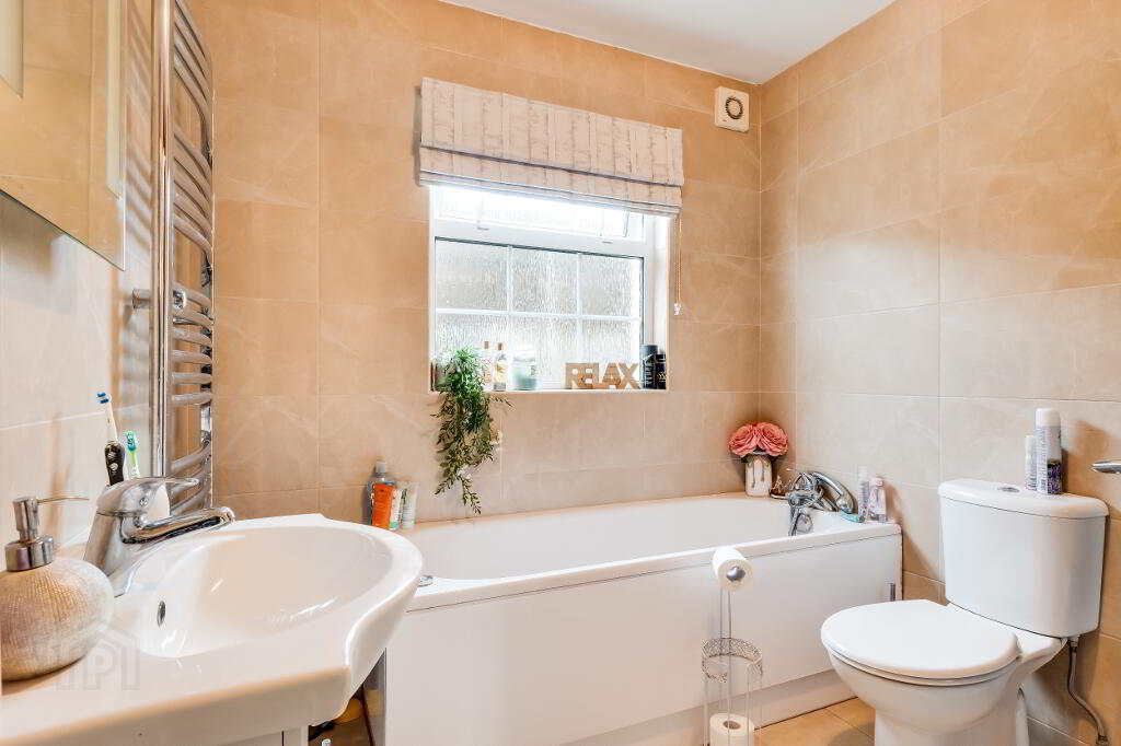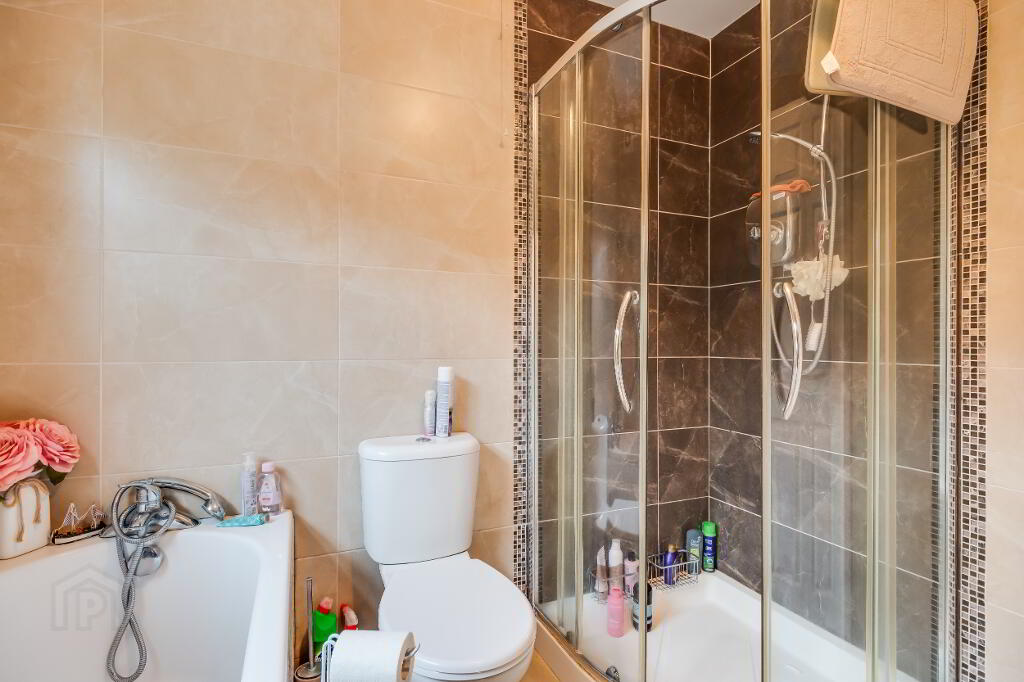 White suite, step in shower cubicle with electric shower, fully tiled, heated towel rail.