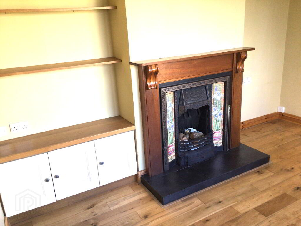 Wooden Flooring. Open fireplace incorporating High-output Back Boiler, with Timber Surround and Tiled Insert and Hearth. Ceiling Cornice. Built in Shelving, Single Panel Radiator.