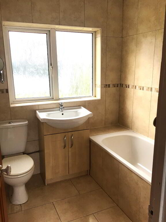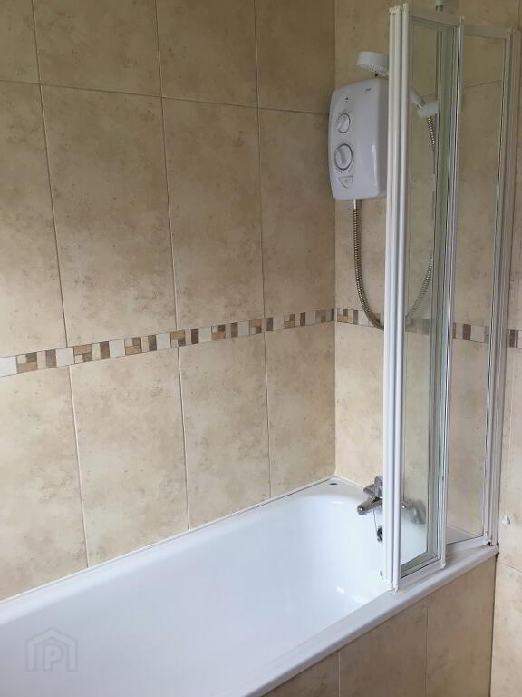 White Suite comprising, Close Coupled WC, Panelled Bath and Pedestal Wash Hand Basin with Storage Unit. Mira Electric Shower over Bath. Fully Tiled Walls. Fully Tiled Floor. Single Panel Radiator.