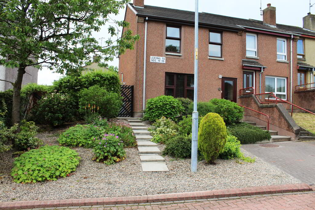 Parking Bay to Front, Concrete Steps to Front Door w/ Railings, Gravel Flower Beds w/ Varied Shurbbery, Slabbed Garden Walkway, Paved Walkaround leading to Gated Side Entrance, Rear Fully Paved Patio Area w/ Raised Garden Arbour, Raised Flower Beds, Double Wooden Shed. Property is North-NorthEast Facing.